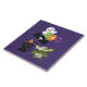 Um azulejo cerâmico com um morcego voador negro, um morcego múmico verde vestindo bandagens brancas e um gato preto bonito com um chapéu de bruxa laranja. Boo escreveu em letras coloridas divertidas com um fantasma feliz flutuando para trás.