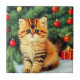 Azulejo com um gato natal vintage! Um gatinho laranja com listras pretas senta-se na neve. Atrás do gato está uma árvore de Natal com ornamentos vermelhos e amarelos. Também na neve há um presente vermelho. Um presente perfeito para a época de Natal e amantes de gatos!