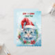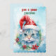 Um belo cartão de Natal de um gato maravilhoso vestindo um chapéu de Papai Noel vermelho situado sobre um fundo azul, o texto diz "Tenha um Feliz Natal"