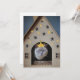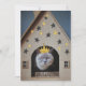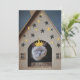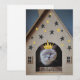Vazio no verso para sua própria mensagem, este cartão de saudação plano apresenta imagem de um gato sério vestindo uma coroa caprichosa enquanto olha para fora de casa decorada com estrelas.