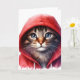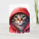 Envie um sorriso com este cartão de felicitações adorável com um gatinho fofinho com um capuz vermelho brilhante. Com seus grandes olhos azuis e estilo artístico de aquarela, este design de gato é perfeito para aniversários, notas de agradecimento ou apenas para alegrar o dia de alguém. Um cartão único e moderno que os amantes de gatos e fãs de capuz vão adorar. Em branco por dentro para sua mensagem pessoal.
