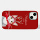 Ilustração natalina retrô fofa com gato com faixa de cabelo de rena em fundo vermelho. Obra original de Caroline Bonne Müller