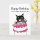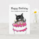 Gato malvado com cartão de aniversário de bolo