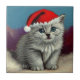 Azulejo cerâmico com um gato de Natal vestindo um chapéu de Papai Noel! Esta gatinho de olhos azuis coloca-se num campo de neve. Um presente adorável para a época de Natal e amantes de gatos!