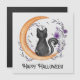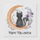 Esta design apresenta um gato preto sentado em uma lua crescente cercado por flores roxas e a frase "Feliz Dia das Bruxas". É perfeito para uma comemoração de Halloween.