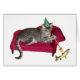 Um doce gatinho vestindo uma festa que reclina num sofá com um punhado de peixes. Faça as pessoas sorrirem quando você enviar este cartão estranho.