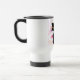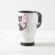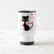 Gato preto com a caneca de viagem cor-de-rosa dos