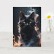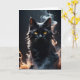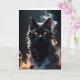 Gato preto intrigante na frente deste cartão de cumprimentos em branco. Pode ser usado para aniversário, parabéns, agradecimento, aniversário de casamento, etc.