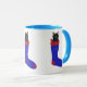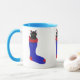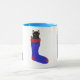 Gato preto bonito e adorável, gatinho em uma estocagem de Natal vermelha e azul, é impresso em canecas personalizadas. Obrigado por comprar em CherylsArt no Zazzle.