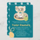 Um doce creme e um gatinho bronzeado vestindo um par de fraldas brancas sustentadas por um alfinete de fralda prateada contém uma garrafa de leite em uma pata e brinca com uma corda verde de uma bola de fio na outra. Ela se senta muito em uma cama de animais de estimação amarela e marrom. Uma bola amarela de fios fica perto da frente do convite juntamente com algumas faixas de gatinho numa forma mais clara do fundo verde azul teal. A parte de trás deste convite para chás de fraldas temáticos para gatos tem um design de padrão de impressão de pata branca e lacrimejada. Trabalho de arte © Chrissy H. Studios, LLC. Todos os direitos reservados.
