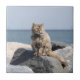 A fotografia de um gato windswept sentou-se em rochas com o mar no fundo.