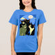 A camiseta, ilustrada por quatro gatos na prowl, com olhos brilhantes, é reunida sob um céu noturno, com lua de cheio e estrelas. O céu é azul profundo, pontilhado com nuvens fofinhas.