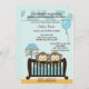 Apresenta DOIS macacos gêmeos no berço do berçário. Um lindo celular para bebês decorado com uma girafa, macaco, elefante e zebra adornam o berço. Apresenta tons de tema de cor AZUL. Este convite pode combinar com qualquer tema de safari da selva e perfeito para o TWIN BOYS.
