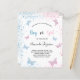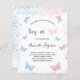 Para um chá de fraldas revelador de gênero. Um fundo branco chic. Decorado com borboletas cor-de-rosa e azuis e poeira brilhante Personalize e adicione o nome da mãe a ser e detalhes da festa. O nome e o texto: Boy ou Girl são escritos com um estilo escrito à mão
