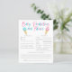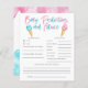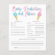 O gênero do tema do sorvete Whimsical revela um cartão de jogo com a ilustração aquarela de cones de sorvete cor-de-rosa e azul. Um jogo perfeito para jogar durante o chá e definitivamente será um excelente! O cartão aos hóspedes para predizer qual seria o gênero do bebê e como seria o seu aspecto.