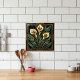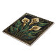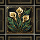 Embrace the elegance of the Art Deco era with this stunning ceramic tile, featuring a stylized geometric depiction of calla lilies. The design showcases the graceful lines of the flowers in creamy gold hues, contrasted by lush, emerald green leaves, all outlined with luxurious gold accents. This piece draws inspiration from the iconic Art Deco movement, characterized by its bold geometric shapes and sophisticated color palette, bringing a touch of vintage glamour and artistic flair to any space. It's perfect for adding a statement piece to your kitchen backsplash, bathroom walls, or as a decorative accent anywhere in your home.