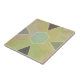 A ceramic tile featuring an earthy palette of soft greens, yellows, and beige with a marbled texture. The design incorporates geometric shapes, including a central hexagon and surrounding triangles outlined in white. This modern yet natural composition brings a serene and balanced aesthetic to any space.