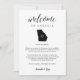 Compartilhe uma mensagem de boas-vindas para seus convidados de casamento Georgia, bem como um itinerário ou calendário dos eventos do fim de semana. Frente mostra sua mensagem de boas-vindas com um mapa da silhueta do estado da Geórgia com um dentro de coração. Personalize o reverso com o dia do casamento ou o itinerário do fim de semana do casamento. Perfeito por incluir nas bolsas de boas-vindas do hotel ou entregar aos quartos dos seus convidados.