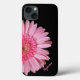 Bonito caso do iPhone 13 feito a preto, com gráficos de uma grande margarida rosa-rosa que pisca, do lado esquerdo do caso. Personalize o texto rosa, como uma ideia de presente excelente para ela.