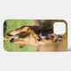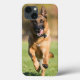 Um cachorro German shepherd revestido de vermelho corre alegremente ao ar livre.