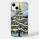 Esta majestosa trabalho de arte retrata uma bela árvore de Natal decorada contra uma serena paisagem de montanha coberta de neve. A árvore é carregada de neve e adornada com ouros brilhantes e ornamentos azuis pastéis. O fundo apresenta montanhas estilizadas, com capas de neve e uma floresta densa, todas rendidas em uma paleta harmoniosa de legal blues, roxas e verdes. Um sol radiante ou estrelado coroa a cena em um padrão brilhante e mosaico de ouro e branco, dando à peça uma qualidade rica, decorativa e espiritual.