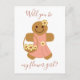 Um cartão postal que pergunta "Você será minha florista?" Mostra o desenho animado de uma pessoa de pão de gengibre, decorada com um vestido cor-de-rosa e uma cesta de flores amarelas.