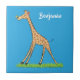 Do safari feliz. Esta girafa bonita tem uma borboleta no nariz com um fundo azul.