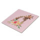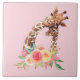Um azulejo cerâmico com um desenho fofo em aquarelas de uma girafa-mãe e bebê. A girafa-mãe está descansando a cabeça sobre a girafa do bebê, amorosa e adorável. Bonito buquê rosa, amarelo, verde, de flor de aquarela colocado debaixo deste par de queridos. Rosa claro.