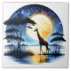 Uma girafa se posiciona graciosamente ao lado de um lago tranquilo, banhado no brilho suave de uma lua de cheio. As árvores abrigadas criam um pano de fundo sereno contra as estrelas cintilantes, refletindo a beleza da natureza à noite numa renderização vívida por aquarela.