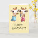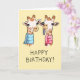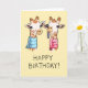 Cartão saudoso, manuscrito, com a imagem de duas girafas do pescoço, com pelo branco e marcas de salto castanho, vestindo os cachecóis (cachecol azul na girafa esquerda e cachecol rosa na girafa direita) e uma girafa enfiando a língua. "Parabéns!" manuscrito em letras maiúsculas abaixo.