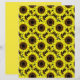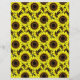 Papel num padrão de grandes girassóis amarelos-ouros, com centros cor-de-chocolate profundos, acentuados com preto