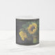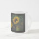 Girassóis com folha verde. Fundo preto. Vaso verde. Um filtro da pintura do impasto foi usado para criar o efeito artístico. A caneca do fosco faria um grande presente do housewarming. Procure o cartão de harmonização que pode ser personalizado com seu próprio texto.