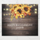 Girassóis russos e lanternas de madeiras para a festa de fundo de madeiras e rótulos de vinho espumante para seu primeiro brinde na festa de aposentadoria. Brinque à sua liberdade e tempo livre para fazer tudo o que você ama fazer!