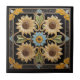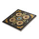 "flores de girassol amarelas", "girassóis", "preto e ouro, "design de arte folclórica inspirada", "jardim de calor quente de verão", "cabeça de flor decorativa", "azulejo de cerâmica floral ornamental", "alivio faux", "aparência antiga vintage"
