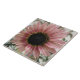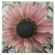 Este azulejo incrível apresenta uma bela fotografia de um girassol rosa pálido. O girassol é naturalmente cor-de-rosa e as pétalas têm um anel exterior cor-de-rosa claro e um anel interior rosa escuro. O meio onde estão as sementes é preto. Esta fotografia foi tirada num jardim.