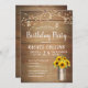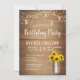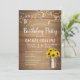 Convite de aniversário russo para conselho de madeira com girassol de aquarela em balde de leite e luzes decorativas de cordas.