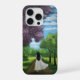 Girl in White Dress A girl in a white dress walking down a path lined with green and purple trees