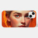 A girl with blue eyes on an orange background, dark black and crimson, photorealistic fantasies, personal iconography, detailed character design, shiny/glossy