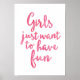 'Girls just want to have fun' watercolor typography poster print features modern hand written typography in pink watercolor. This print is suitable in a little girl to teenager's room. Simple yet stylish.
