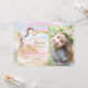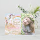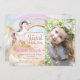 Convites de festas de aniversários de unicórnio fotográfico com bonito púrpura cor-de-rosa-rosa e unicórnio azul-lacrimogênio e arco-íris numa bela nuvem de ouro com espaço para a sua foto. Este belo convite de aniversário de unicórnio fotográfico é facilmente personalizado para o seu evento simplesmente adicionando a sua fotografia e os detalhes do evento no estilo de letra da sua escolha. Você também pode alterar a cor de fundo. Este é um design impresso sem brilho real.