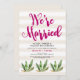 Este convite elegante e divertido para recepção pós-casamento apresenta ilustrações de cactus, com tipografia rosa escura em um fundo listrado neutro, para um visual desértico glamoroso. Arte listrada da Indie Grace Designs.