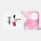 Uma capa de telefone com uma design de estilo de vidro. Batom rosa quente e verniz das unhas. A garrafa de esmalte está aberta, deitada do lado, com gotas de esmalte a sair. A borda superior é decorada com uma cor rosa-doce de algodão com uma fina camada de brilho prateado.
