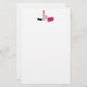 Papel de papelaria com um design de estilo de vidro. Batom rosa quente e verniz das unhas. A garrafa de esmalte está aberta, deitada do lado, com gotas de esmalte a sair.