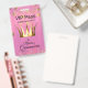 Quic Quinceañera, crachá acessório do partido feito em um olhar cor-de-rosa, com uma coroa dourada e gráficos de ouro reluzente, ao longo de cima e de baixo. O texto preto está pronto para personalizar o grande dia da sua filha.
