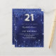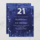 Um convite moderno, na moda e glamouroso para um aniversário de 21 anos. Um fundo azul marinho, decorado com poeira falsa brilhante. A cor azul é irregular. Personalize e adicione seu nome e detalhes da festa. O número 21 é escrito com uma fonte no estilo do balão, script, cor prateada.