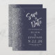 A borda esquerda deste elegante casamento moderno salve o cartão de data apresenta uma borda cintilante. O texto personalizável combina o script de escrita manual de cinzas prateadas e o tipo de letra sans serif num fundo azul escuro. O verso apresenta um design azul escuro e prateado correspondentes.