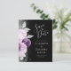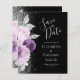 A borda esquerda deste elegante casamento moderno, exceto o cartão de data, apresenta um buquê floral em tons de roxo e lavanda, cortado com folha de cor prateada e folhagem falsa e borrifada com cintilação falsa e salpicada com cintilação falsa prateada. O texto personalizável combina o script de escrita manual de cinzas prateadas pálidas, fontes em copperplate e itálico em um fundo preto. O verso apresenta um design floral correspondente.