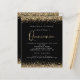 Dourada Glitter Quinceañera 15, Convite Preto. Um alternativo de 4,5 pol x 5,6 pol com preço inferior. Disponível em um STOCK DE CARTÃO SEMI-GLOSS 110 lb, que é a opção padrão (mais espesso para convites), OU um STOCK de PAPEL THINNER FINISH 80 lb FINISH (ideal para gabinetes). As bordas de confete de falso ouro elegantes estão no topo e no fundo e também no verso. Quinceañera é feita no estilo moderno da caligrafia. Personalize facilmente o resto do texto para você.