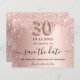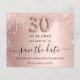 Uma moeda e uma tendência Salve a placa de Data para um aniversário de 30 anos. fundo rosa de gradiente dourado decorado com ouro rosa e brilho prateado falso e poeira. Personalize e adicione uma data e um nome/texto. O texto: Salvar a Data é gravado com um script de estilo com letra de tendência grande com alternâncias. Número 30 com uma fonte no estilo do balão.