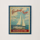 Esta saudação de Gloucester Massachusetts viagens vintage náutico apresenta um barco navegando na água com gaivotas e um céu azul cheio de lindas nuvens brancas puffy.